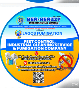 The company is a subsidiary of Lagos Fumigation Global and a proud member of the Pest Control Association of Nigeria (PECAN). Fully registered and certified by the Lagos State Environmental Protection Agency (LASEPA), Ben–Henzzy operates strictly in compliance with environmental health and safety standards, ensuring sustainable and eco-friendly service delivery.